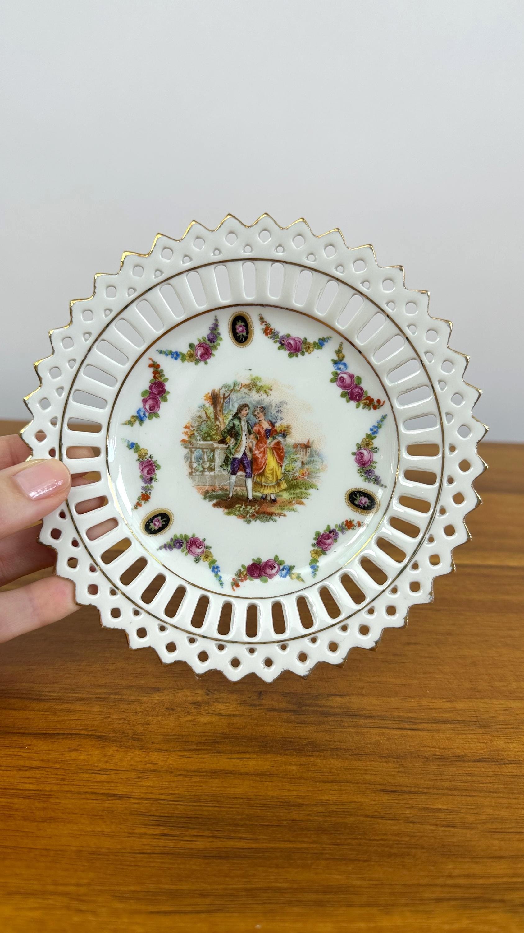 Vintage Schumann Arzberg Bavaria porcelain plate- German Reticulated Porcelain Plate: Courting Couple Scene, Gold Trim