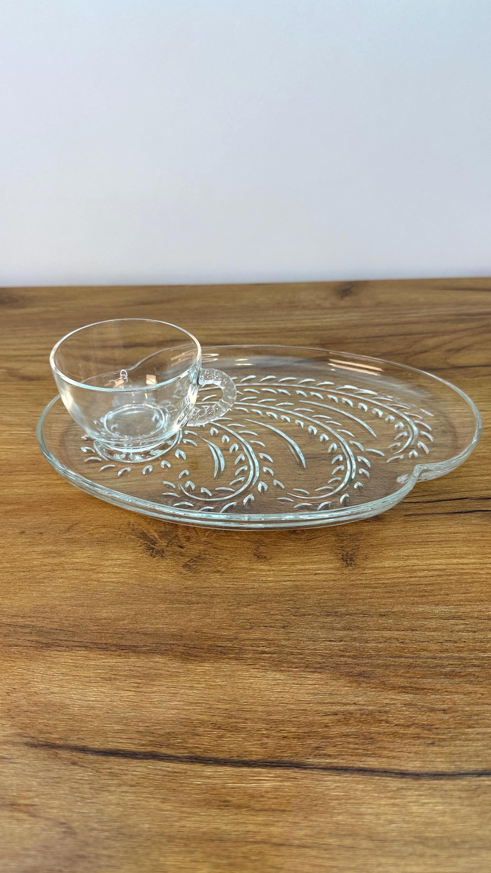 Vintage Mid-Century teacup and snack plate set. This is a Vintage Federal Glass Homestead clear glass plate with cup set. The tray has a little space for the cup to fit into.