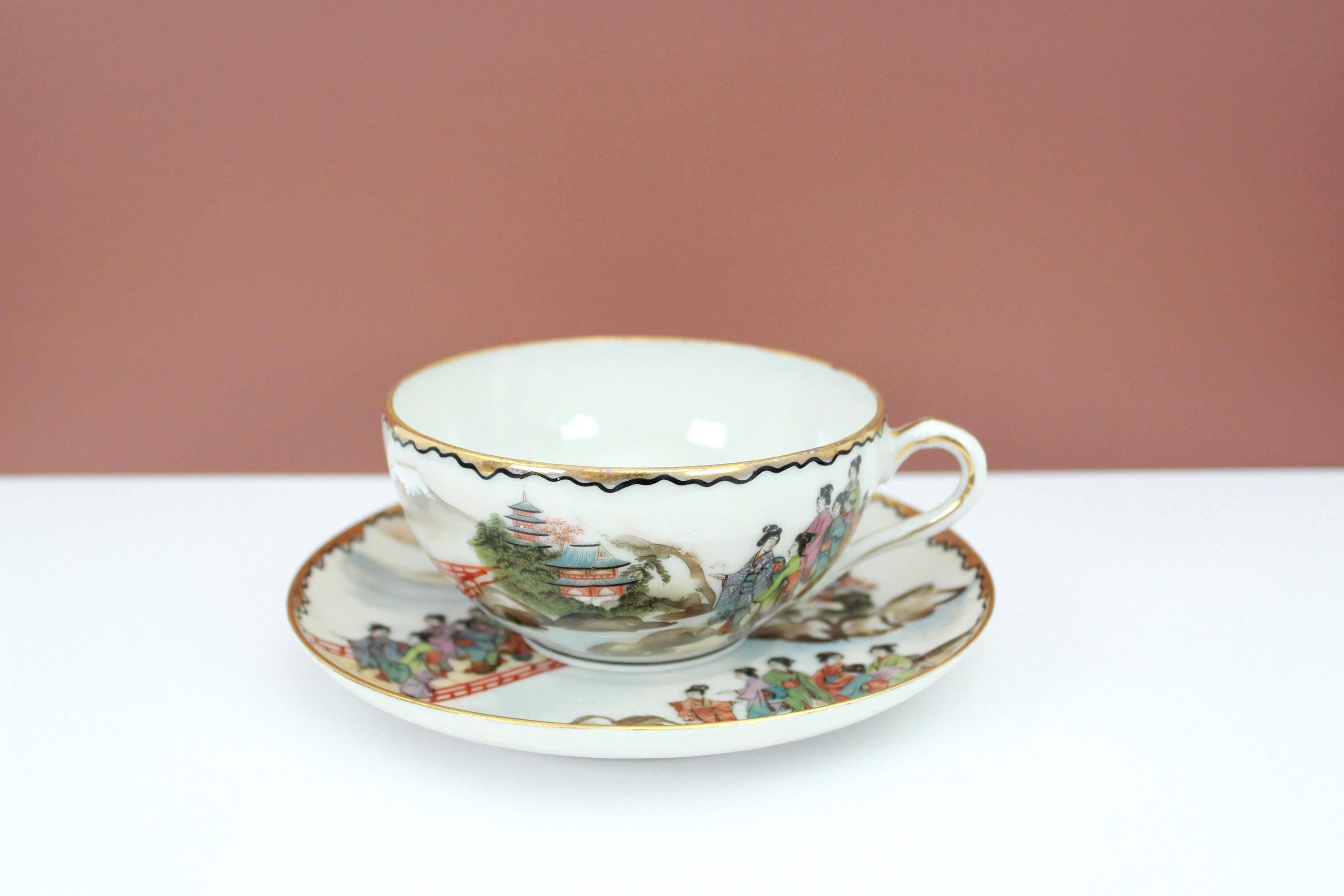 Hand Painted Japanese Lithophane Tea Cup and Saucer | Nippon Kutani Porcelain Geisha Tea Cup